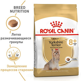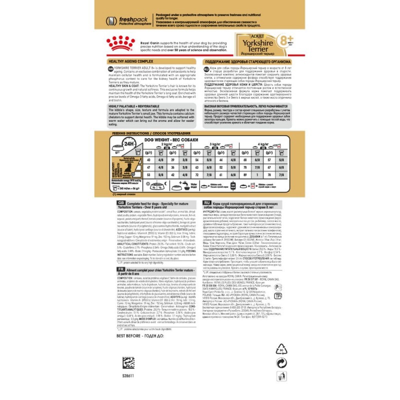 Йоркширский терьер 8+: корм для собак породы Йоркширский терьер в возрасте от 8 лет и старше разработан для поддержания здоровья в старости. Эксклюзивный комплекс антиоксидантов помогает сохранить здоровье клеток, а оптимальное содержание фосфора способствует поддержанию здоровья почек стареющих собак.