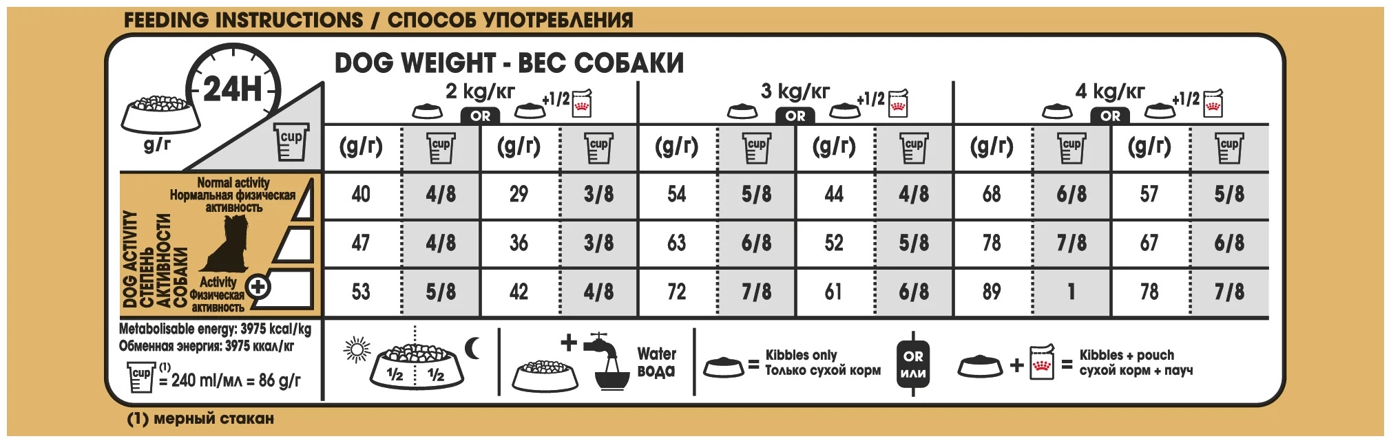 см. таблицу. Корм готов к употреблению. Проследите, чтобы у вашей собаки всегда была свежая вода. Номер серии, регистрационный номер завода-изготовителя и срок годности указаны на упаковке. Хранить в сухом, прохладном месте.