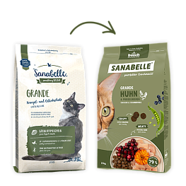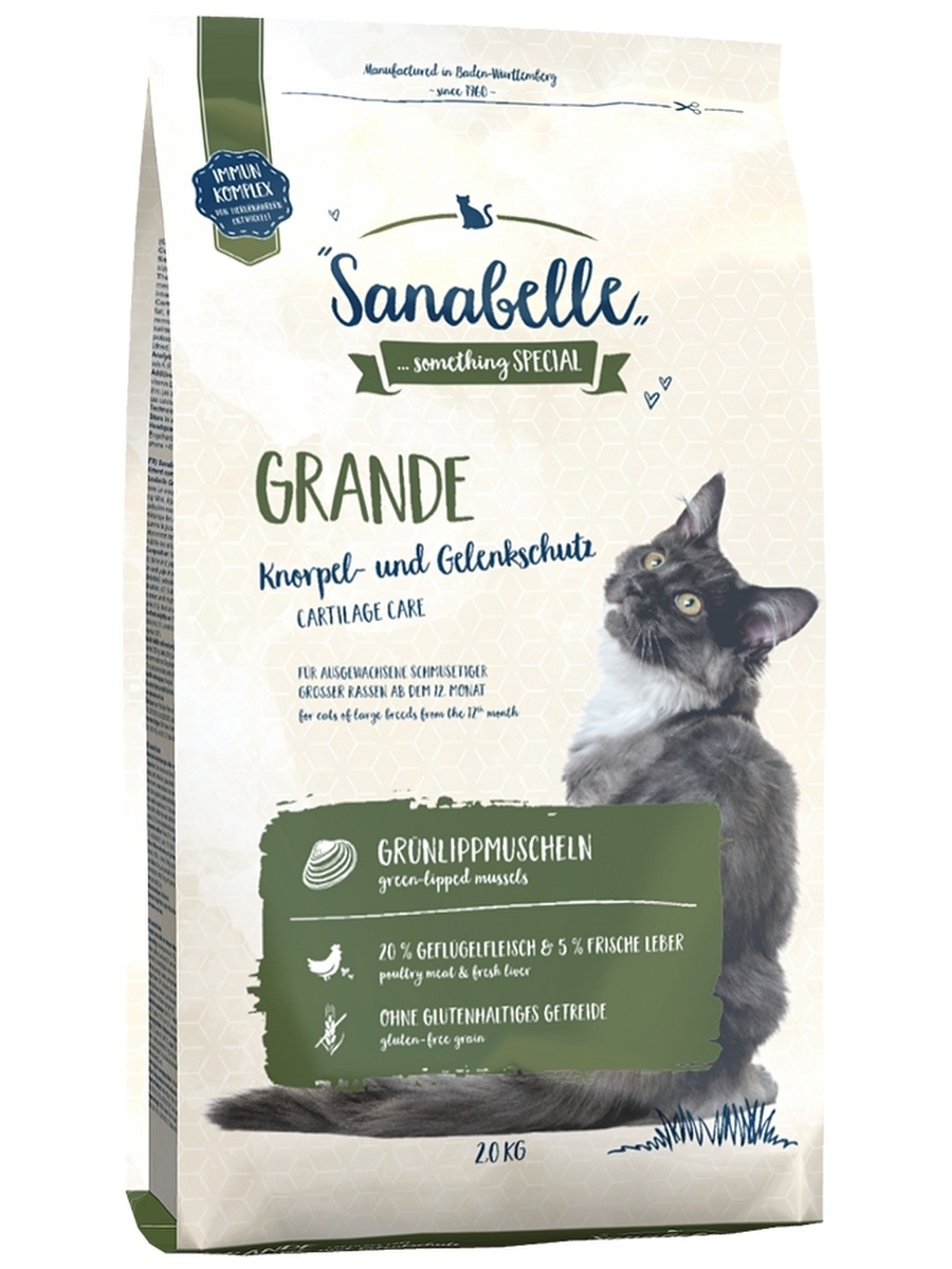 Корм Bosch Sanabelle GRANDE произведён на основе свежего мяса домашней птицы для взрослых кошек крупных пород. Состав корма, насыщенный питательными веществами и минералами, позволяет кошкам получать все необходимые элементы, способствует нормализации пищеварения и не вызывает аллергий. Корм легко усваивается и даёт кошкам заряд бодрости и энергии. Высокое качество ингредиентов даёт корму насыщенный и выдающийся вкус. Использование экстракта зеленогубчатого моллюска благотворно влияет на развитие хрящей и суставов животного. Особая форма и размер крокета специально разработаны для кошек крупных пород. Содержит в 4 раза больше витамина Е, который  оказывает антиоксидантное действие в обмене веществ и предотвращает некрозы в  печени. Содержание здесь Биотина почти в два раза больше чем в обычных кормах линейки Sanabelle, он препятствует выпадению шерсти и предупреждает преждевременное поседение. Так же этот элемент способствует прочности сухожилий и связок, уменьшению мышечной боли у взрослых кошек.