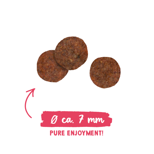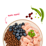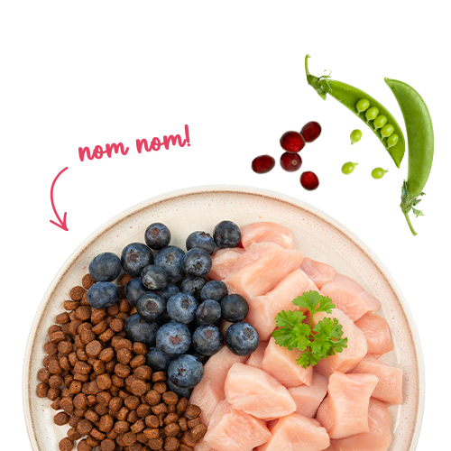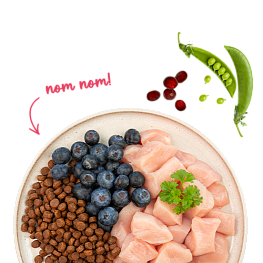 Состав: свежее мясо курицы (25 %), кукуруза, ячмень, белок из птицы (сушеный), животный жир, кукурузный белок, белковый гидролизат, семена льна, карбонат кальция, рис (1 %), мука, горох (сушеный, 0,4 %), ягоды брусники (сушеные, 0,1 %), ягоды голубики (сушеные, 0,1 %), петрушка сушеная (0.1 %), дрожжи (сушеные, 0,1 %), хлорид калия, цветы календулы (сушеные, 0,05 %).