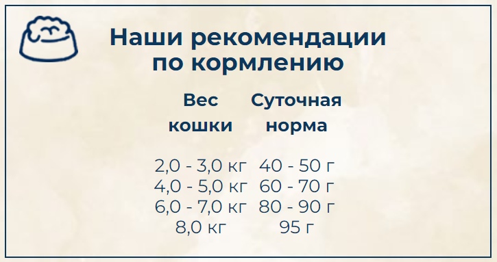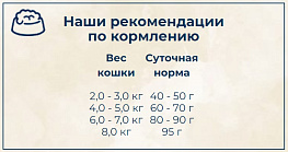 Пищевые добавки на килограмм: витамин A: 17.500 МЕ, витамин D3: 1.500 МЕ, витамин E: 150 мг, таурин: 2.000 мг