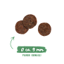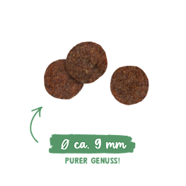 Состав: свежее мясо курицы (25 %), кукуруза, белок из птицы (сушеный), животный жир, шкварки (сушеные), рис (4 %), белковый гидролизат, рисовая мука, кукурузный белок, гороховые волокна, рыбная мука, мука, карбонат кальция, масло лосося (0,5 %), хлорид калия, ягоды брусники (сушеные, 0,1 %), ягоды голубики (сушеные, 0,1 %), петрушка (сушеная, 0,1 %), дрожжи (сушеные, 0,1 %), цветы календулы (сушеные, 0,05 %).