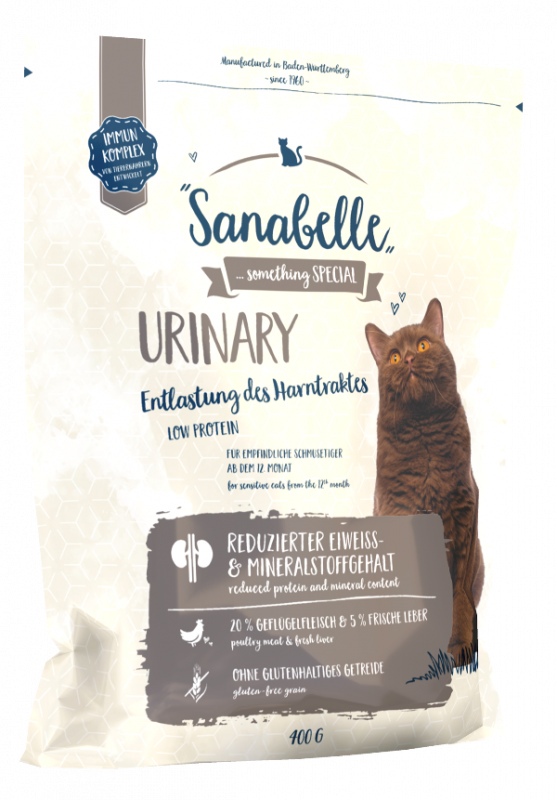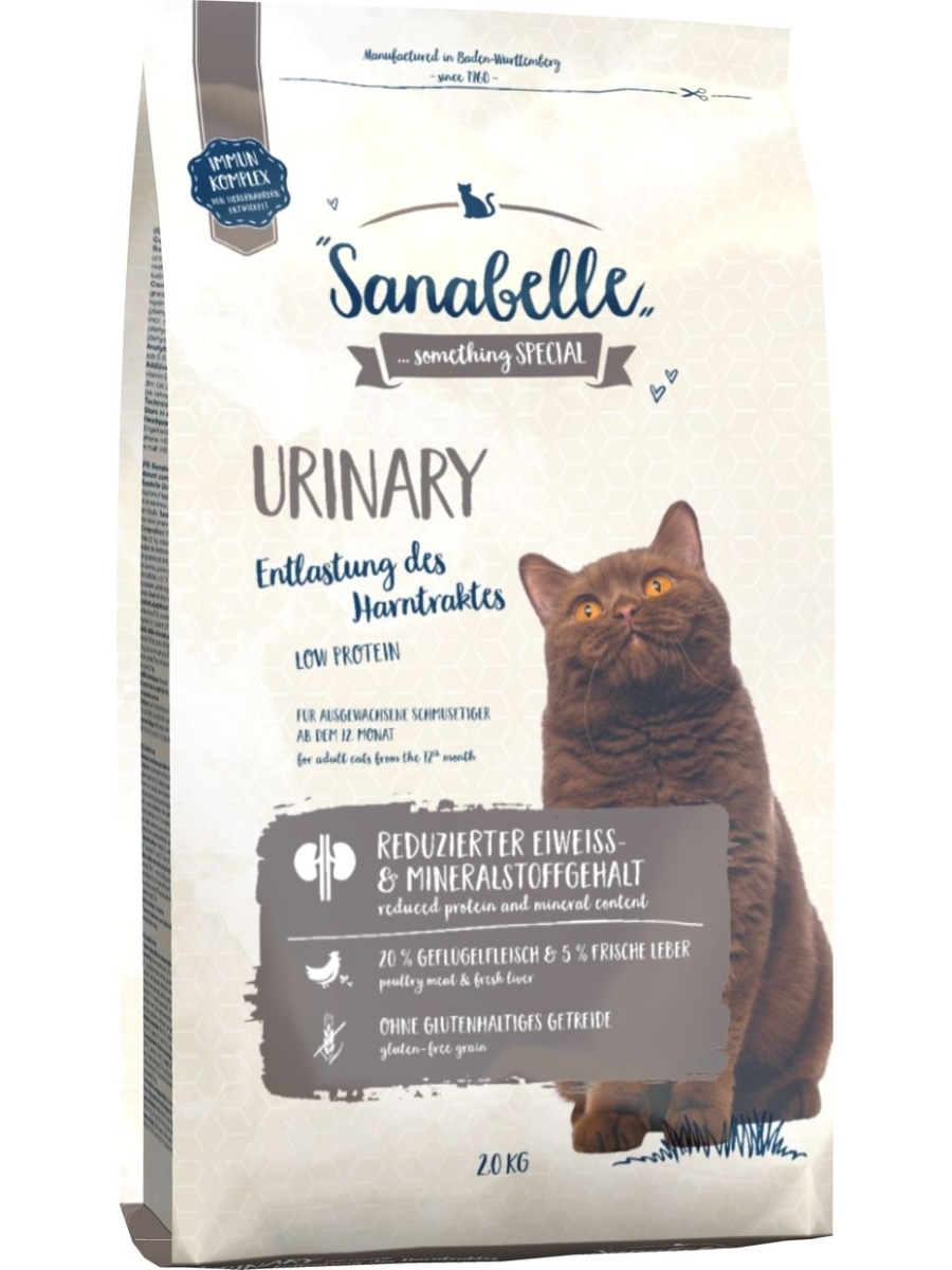 Сухой корм Bosch Sanabelle URINARY произведён на основе свежего мяса домашней птицы для взрослых кошек всех пород с чувствительной мочеполовой системой. Особый состав сухого корма Sanabelle URINARY, насыщенный питательными веществами и минералами, позволяет кошкам получать все необходимые элементы, способствует нормализации пищеварения и не вызывает аллергий, при этом снижается нагрузка на почки и мочеполовую систему и нормализуется их работа. Сухой корм Sanabelle легко усваивается и даёт кошкам заряд бодрости и энергии. Использование экстракта зеленогубчатого моллюска благотворно влияет на развитие хрящей и суставов животного. Высокое качество ингредиентов даёт корму насыщенный и выдающийся вкус. Повышенное содержание витамина А способствует образованию зрительного пигмента - родопсина.