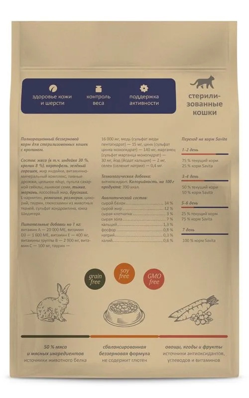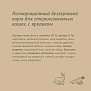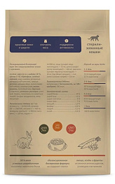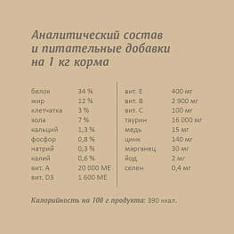 Аналитический состав: сырой белок 34%, сырой жир 12%, сырая клетчатка 3%, сырая зола 7%, кальций 1,3%, фосфор 0,8%, натрий 0,3%, калий 0,6%. Калорийность 390 кКал Питательные добавки на 1 кг: витамин A 20 000 МЕ, витамин D3 1 600 МЕ, витамин E 400 мг, витамины группы В 2900 мг, витамин C 100 мг, таурин 16000 мг, медь (сульфат меди пентагидрат) 15 мг, цинк (сульфат цинка моногидрат) 140 мг, марганец (сульфат марганца моногидрат) 30 мг, йод (йодат кальция) 2 мг, селен (селенит натрия) 0,4 мг Технологические добавки: антиоксидант