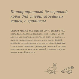 Состав: мясо (в т.ч. индейка 30 %, кролик 8 %), картофель, зелёный горошек, жир индейки, витаминно-минеральный комплекс, пивные дрожжи ,цельное яйцо, пульпа сахарной свёклы, льняное семя, тыква, морковь , лососёвый жир,брусника, L-карнитин, ромашка, розмарин, цикорий, таурин, глюкозамин из животных тканей, сульфат хондроитина, юкка Шидигера