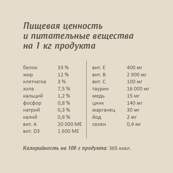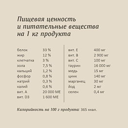 сырой белок 33%, сырой жир 12%, сырая клетчатка 3%, сырая зола 7,5%, кальций 1,2%, фосфор 0,8%, натрий 0,3%, калий 0,6%.