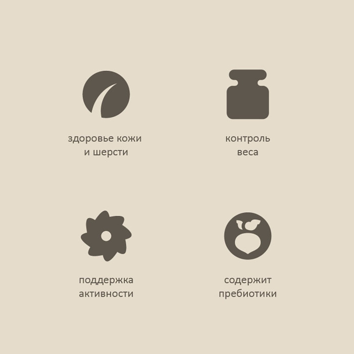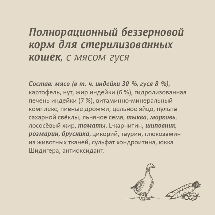 мясо (в т.ч. индейки 30 %, гуся 8 %), картофель, нут, жир индейки (6%), гидролизованная печень индейки (7%), витаминно-минеральный комплекс, пивные дрожжи ,цельное яйцо, пульпа сахарной свёклы, льняное семя, тыква, морковь , лососёвый жир, томаты, L-карнитин, шиповник, розмарин, брусника, цикорий, таурин, глюкозамин из животных тканей, сульфат хондроитина, юкка Шидигера, антиокидант.