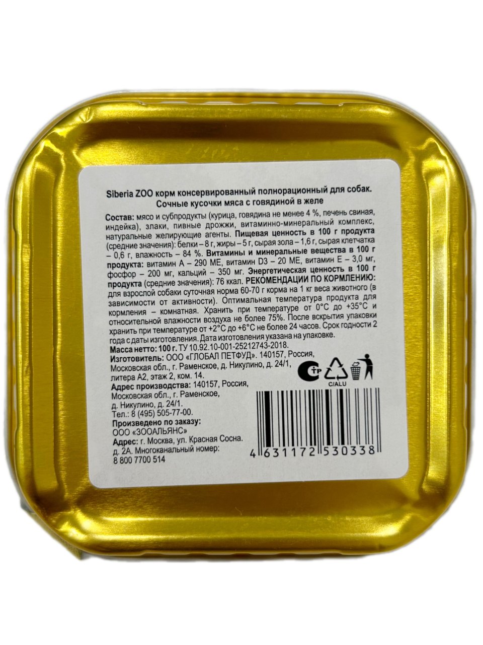Рекомендации по кормлению: Для взрослой собаки суточная норма 60-70 г корма на 1 кг веса животного (в зависимости от активности). Оптимальная температура продукта для кормления - комнатная. Хранить при температуре от 0°C до +35°C и относительной влажности воздуха не более 75%. После вскрытия упаковки хранить при температуре от +2°C до +6°C не более 24 часов. Срок годности 2 года с даты изготовления.