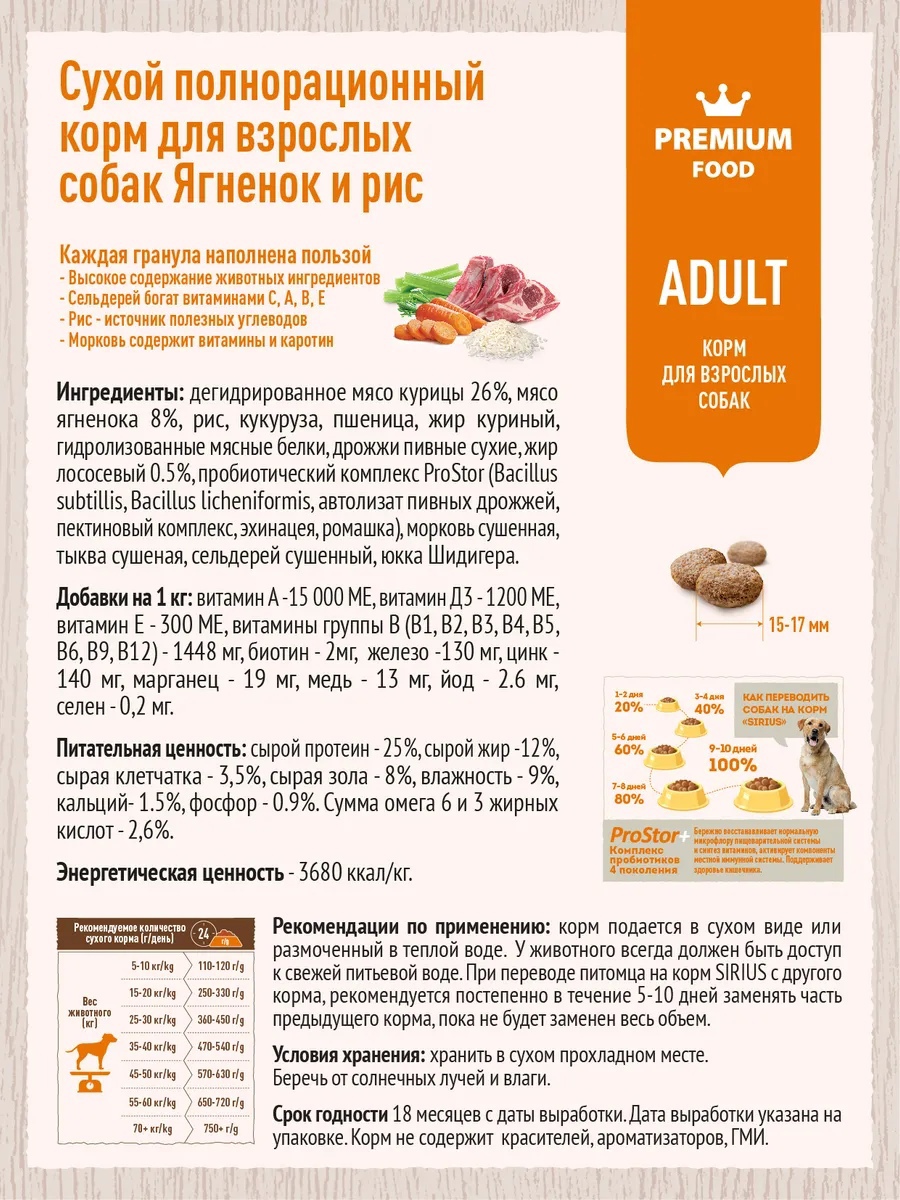 SIRIUS — сухой корм премиум класса для полноценного ежедневного рациона взрослых собак. Высокое содержание мясных ингредиентов обеспечивает оптимальный уровень белка и укрепляет мышцы. Баланс витаминов и комплекса пробиотиков 4-го поколения PROSTOR+ нормализует пищеварение и укрепляет иммунитет. Омега 3 и Омега 6 способствуют поддержанию здоровья сердца, мозга, нервной системы, здоровья кожи и красоты шерсти.