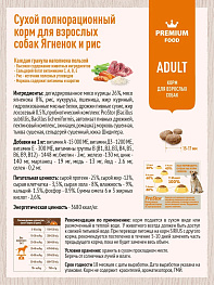 Дегидрированное мясо (курицы 26%, ягненка 8%), рис, кукуруза, пшеница, жир куриный, гидролизованные мясные белки, дрожжи пивные сухие, жир лососевый 0.5%, пробиотический комплекс ProStor+ (Bacillus subtillis, Bacillus licheniformis, автолизат пивных дрожжей, пектиновый комплекс, эхинацея, ромашка), морковь сушеная, тыква сушеная, сельдерей сушеный, Юкка Шидигера.