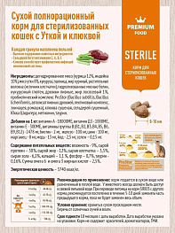Дегидрированное мясо (курица 12%, индейка 10%), мясо утки 8%, кукуруза, пшеница, жир куриный, растительные волокна (источник клетчатки), гидролизованные мясные белки, кукурузный глютен, дрожжи пивные, жир лососевый 1%, пробиотический комплекс ProStor+ (Bacillus subtillis, Bacillus licheniformis, автолизат пивных дрожжей, пектиновый комплекс, эхинацея, ромашка), клюква сушеная, сельдерей сушеный, Юкка Шидигера, метионин, таурин.