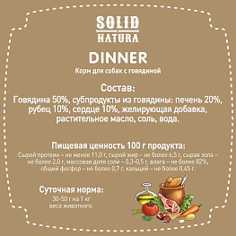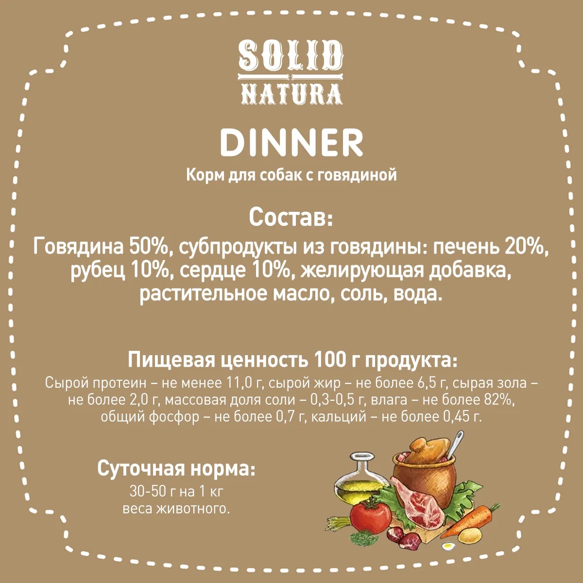 Субпродукты говяжьи: печень 20%, рубец 10%, сердце 10%, желирующая добавка, растительное масло, соль, вода.