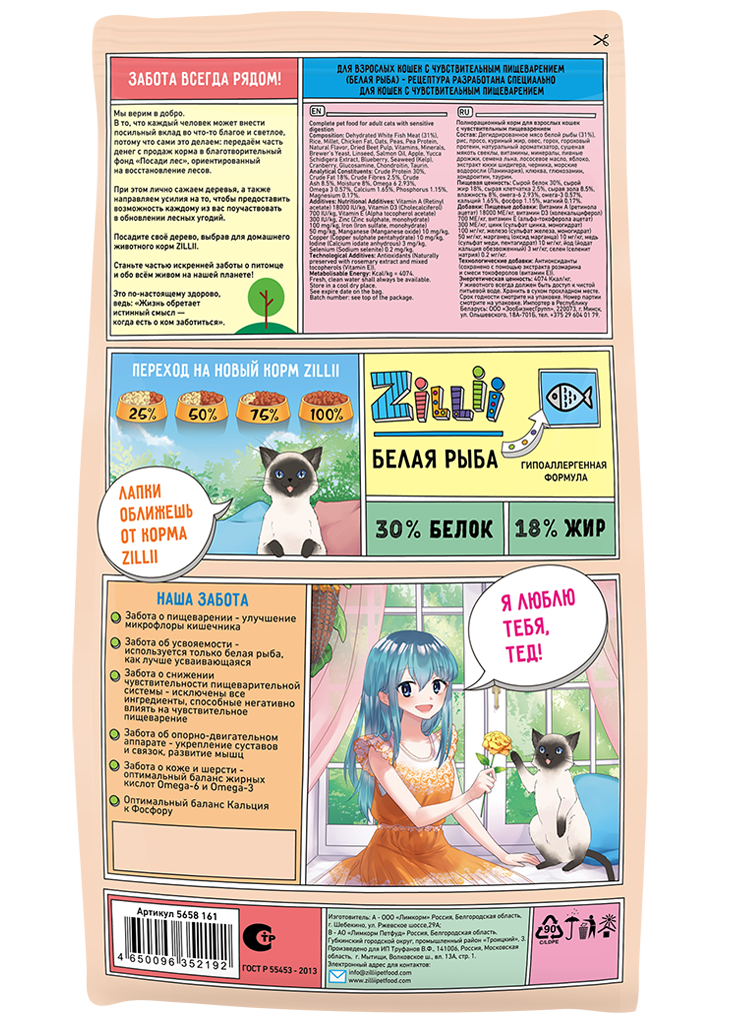Рецептура ZILLII SENSITIVE DIGESTION специально создана для кошек с чувствительным пищеварением. Белая рыба прекрасно подходит для чувствительного пищеварения из-за высокой усвояемости и гипоаллергенности. В белой рыбе рекордное количество качественного белка, при этом минимум калорий. В мясе белой рыбы содержатся в большом количестве витамины группы А и С, а также группы B (особенно важные среди них — В6 и В12), которые способствуют детоксикации организма и борются с воспалительными процессами. Из рецептуры исключены все основные ингредиенты, которые могут оказать негативное влияние именно на чувствительное пищеварение. Формула сбалансирована так, чтобы удовлетворить все потребности организма животного в питательных веществах. Экстракт юкки шидигера снабжает организм натуральными пребиотиками. Пребиотики способны выборочно стимулировать рост и активность полезных бактерий толстого кишечника, нормализовать микрофлору кишечника, препятствовать возникновению дисбактериоза, положительно влиять на функции кишечника, предупреждать возникновение и развитие гнилостных процессов и избыточного газообразования в кишечнике, что благотворно сказывается на процессах пищеварения.